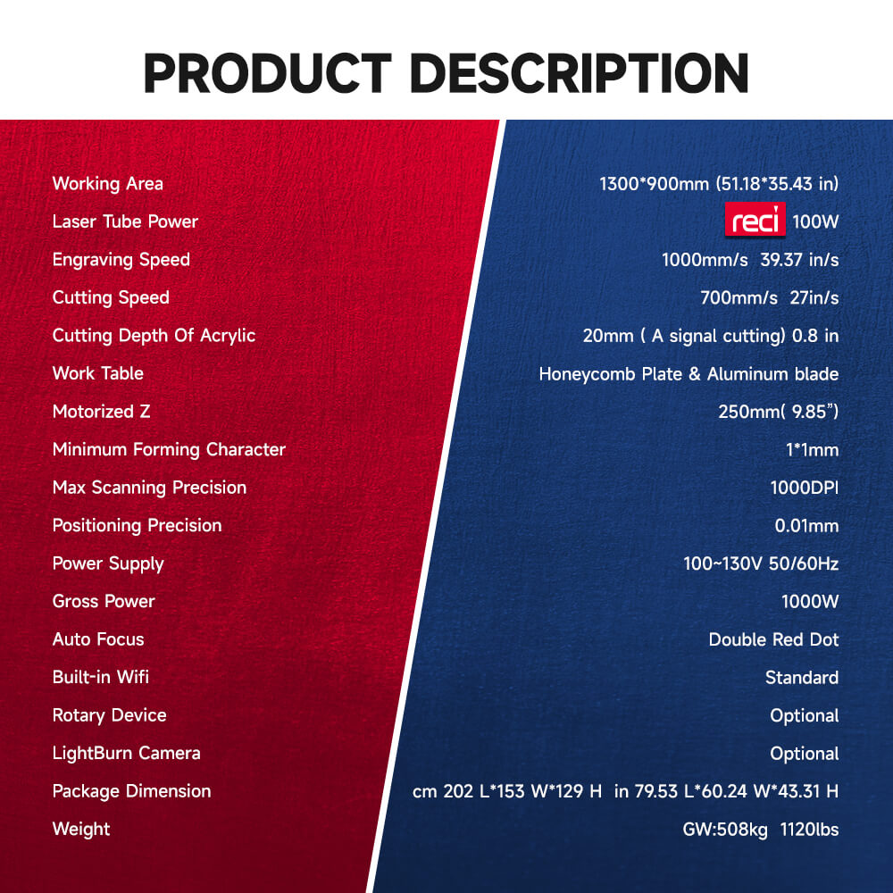 1.Certification for the laser engraving machine: CE IEC FDA certified 2. Power supply: AC 110/220 V ± 10%, 50/60 Hz 3. Working size: 51.2in" x 35.4" (1300 mm × 900 mm) Aluminum blade & Honey Comb Plate 4....